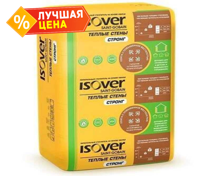 Isover Теплые Стены Стронг - плиты повышенной жесткости, которые гарантируют устойчивость в конструкции. Это тепло-звукоизоляция из минеральной ваты с усиленными водоотталкивающими свойствами. Материал производится из природных компонентов: кварца, соды, известняка. Является безопасным материалом для здоровья человека и окружающей среды: сертифицирован для применения в детских и медицинских учреждениях.